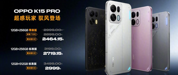天玑8500、7500mAh大电池、IP69防尘防水,主动散热风扇,这一套组合,两千四百多块就能打包带走。这就是刚发布的OPPO K15 Pro,12GB+256GB简装版,首销价2899,叠完国补之后,到手2464.15元。行业首发疏密错位散热鳍片,加上超大面积手撕钢VC均热板,50%转速下风扇噪音才19dB,比很多笔记本散热还安静。主动散热这个配置,现在降到了2464这个档,有点降维了。重量197g,6.59英寸1.5K OLED 144Hz直屏,主摄5000万OIS防抖,该有的没落下。要说有啥硬伤,超广角800万这个数字放到2026年稍微有点抠,但你指着它大量拍风景的话,这价位别太苛刻。设计方面,背部三颗岚影呼吸灯,支持流光色彩自定义、音乐/游戏联动,来电还有专属灯效。配色选了「赛博光翼」「光尘粉」「起源灰」,还有行业首个原厂锻造碳「金色传说」。全系金属中框 + 高强度晶盾玻璃,超薄卡片镜头模组凸起不到 0.6mm。而K15 Pro+的12+256 简装版:原价 3499 → 首销 3099 → 国补后 2634,比Pro贵了170块整。贵在哪?芯片换成了天玑9500s,3nm旗...