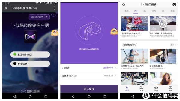 下载安装暴风魔镜VR APP以后,选着暴风魔镜小D2,即可进入在线影音视频界面,支持2D、3D,大片、直播、图片、漫游等观看,也可以打开播放本地视频。