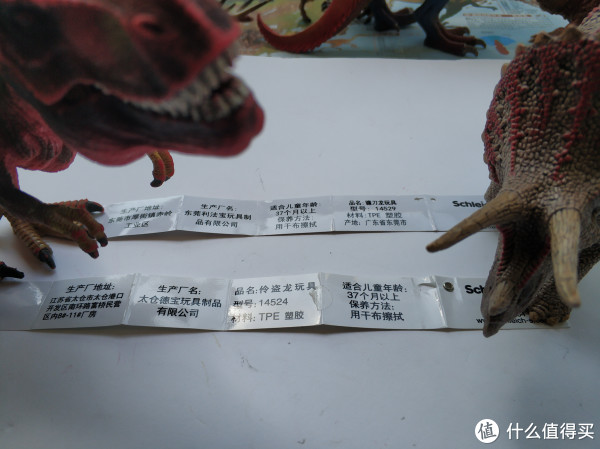 这两只恐龙脚上的商标不一样,仔细一看,一家代理商是北京孩思乐商业有限公司,另一家是广州智乐商业有限公司,但应该是同一个公司吧。警告信息是不适用于3岁以下儿童玩耍,应该是担心玩耍时,恐龙的尾巴、爪子或者头部比较细长,有可能伤到孩子吧。