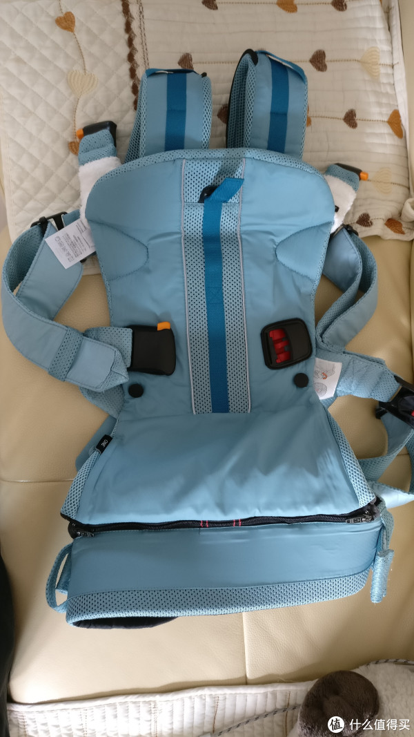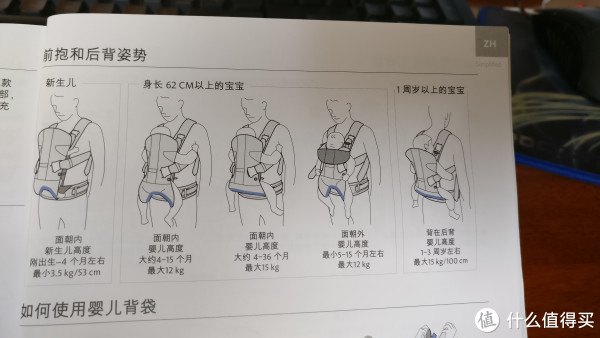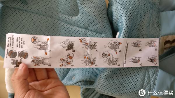 背带总共有5种不同背法(其实只是3种,面朝内,面朝外以及背在背后,只是针对新生儿以及月龄不同的宝宝有不同的坐垫宽度设定以及拉链位置调整),在说明书里写得都很具体,这里就不一一列举。大家一眼就明白。