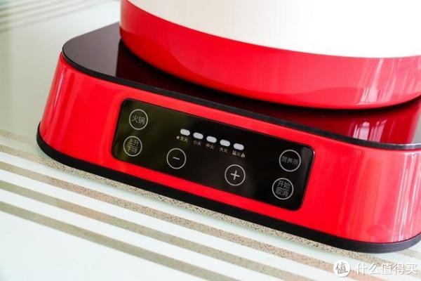 锅体下面就是底座,同样的红色,前面是黑色的集成操作台,右下角是启动开关,左右分别是"火锅"与"营养蒸"两个不同的模式,"火锅"模式下面则是控制升降的开关,中间的加减号用于调节功率,一共5个档位,对火力的调节把握的相当准确,煮什么都不怕。底座两边是便于拿起的凹陷,符合人体工程结构。