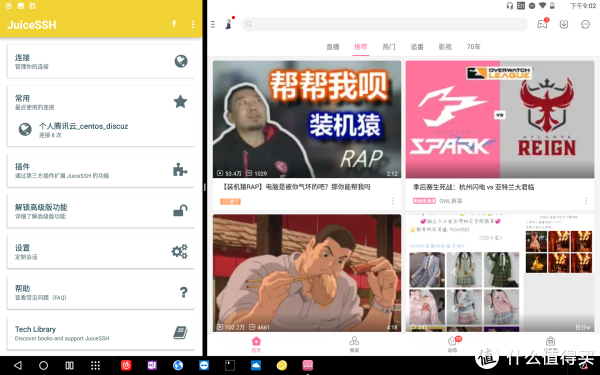 自带的分屏只能分成左右两个占满屏幕的,不能像华为m6那样分成一个个小窗口。这点有点羡慕m6惹,窗口多开的生产力比较足。左边打开的JuiceSSH,平时学习的时候我就是这样一边b站看学习视频(讲道理,b站各种学习视频真不少),一边ssh连接到腾讯云实验学习