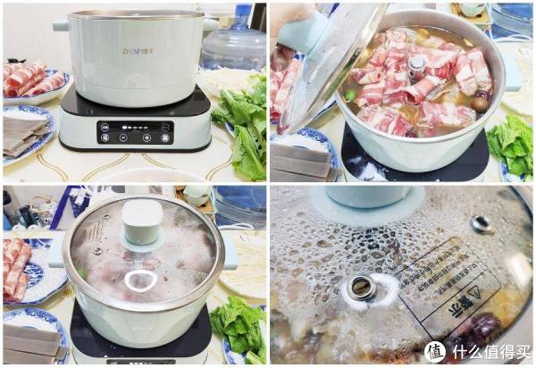 从使用过程中来看,锅内加入三分之二即可,避免“猛火”下水沸腾后溢出。加热后水开的速度很快,放入食材5-8分钟即可开始食用了。开锅后锅体和底座表面也不会烫手,使用安全性很高。