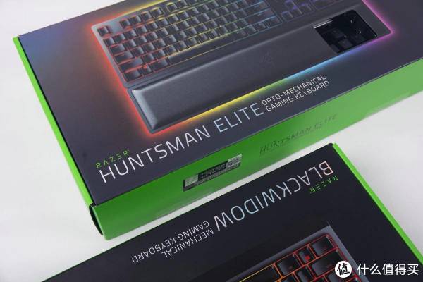 包装一角标注了键盘使用的轴体。雷蛇猎魂光蛛精英版使用的是特别开发的光轴轴体,蜘蛛使用的是雷蛇自家的绿轴。