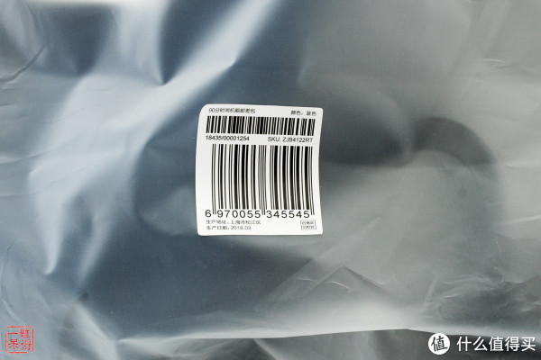 ▼ ▽半透明塑料袋上有标签,仔细看标明了邮差包的颜色是蓝色的,产地是上海松江,生产日期是2018年3月。