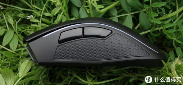 左侧的防滑橡胶面积比较大。两颗微动面积适中,本身表处理成了磨砂纹理,所以并不像图中看起来那么光滑。