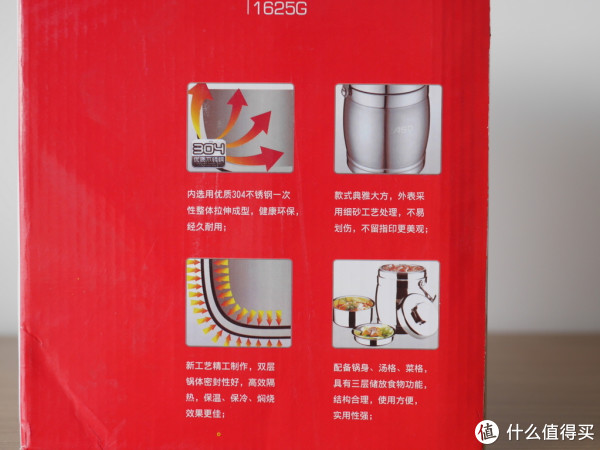 包装上清楚标明是304不锈钢,双层钢体的密封结构,另外也有多层设计,