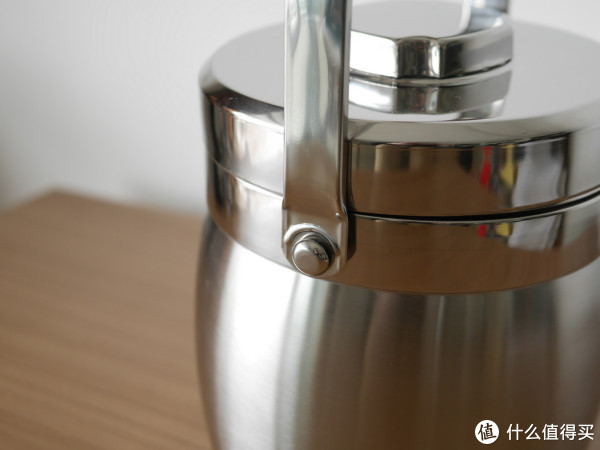 2.5L的体积确实比较大,从小到大保温壶就没见过这么大的,外观整体都是不锈钢,没有一丝塑料包裹,看到的全是浓浓的金属味道,把手铆钉固定的,但是铆钉很松垮,并没有弄得很紧,