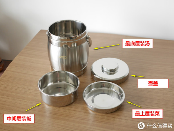 也是多层设计,保温壶机身算一层,实际上是用来装汤水的,然后稍大的一层是装饭层,最小的一层是装菜层,显然对于我来说如果按照这样的使用肯定不行的,这点菜哪里够,所以平时使用我并没有用最上面一层,几层并没有单独的密封盖子设计,只是简单的重叠摆放,没有什么设计上的技术含量,