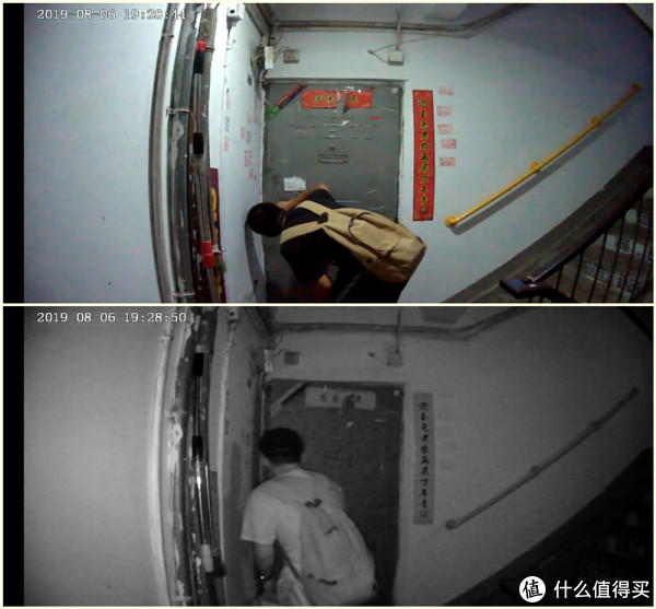 上图是APP移动侦测提示下的手机视频截图,楼道内有无灯光都可以侦测、记录、推送,斑点猫X1虽然仅配备了200w像素摄像头,但在昏暗的光线条件下可以达到高清画质,在完全无光、肉眼不可视时画质有所降低并自动调整为黑白模式,依然可以记录到镜头前的一举一动,而且两种光线条件下的切换非常迅速,达到了应有的效果,此外140度的广角能看到比原物理猫眼更宽广的区域,记录下更多画面信息,对于观察室外情况非常有利。