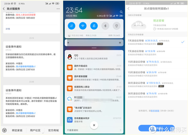 做为一款物联网智能产品,斑点猫X1的视频、抓拍等记录会进行云存储服务,方便用户调取、回看、下载,首年免费,之后用户可以选择购买最长滚动保存30天的相关存储服务,可以选择不同时长的包年或者永久,选择范围比较大,我个人觉得39.9元7天滚动云存永久版最为超值。