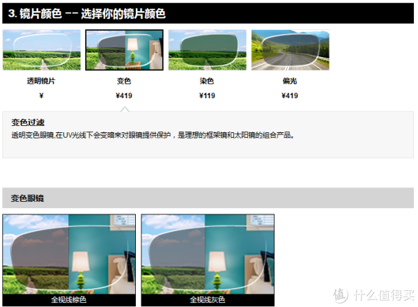 根据验光师的建议,我选择的是变色镜片,全视线灰色: