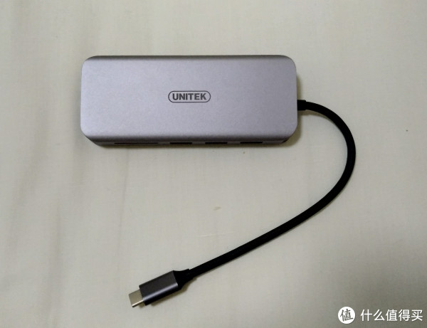官方数据:120x50x18mm,最厚处18mm,最薄处13mm;线长375px,又黑又粗(哈哈哈~)刚好够用,个人感觉这类线375px最完美(但也因人而异,看个人习惯),长短适中,方便插入,又抽插自如(一本正经的滑稽脸)。此钨正面有优越者logo“UNITEK”,钛空灰色,阳极氧化铝一体成型,具有质轻、防指纹、防刮花,最重要的是金属散热效果更好;而且Type-C头也是金属外壳,线材是磨砂质感,手感好、吸汗、防刮花。侧面看有点梯形的感觉,平放的话可以当作手机支架,让手机躺下休息。