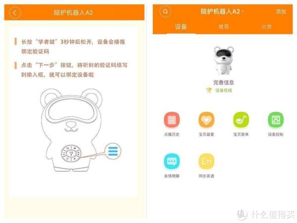 长按学者键后机器人会报出一个验证码,按照提示输入,可以完成绑定;绑定完成后,可以在APP上根据孩子的需求、喜好完善相关的信息,可以方便使用,整个操作过程一般会在3-5分钟内完成,操作简单。