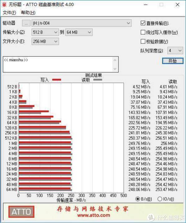 随后使用ATTO再次进行了测试,数据稳定在读取254+MB/s,写入248+MB/s左右,也比官方速度要快。