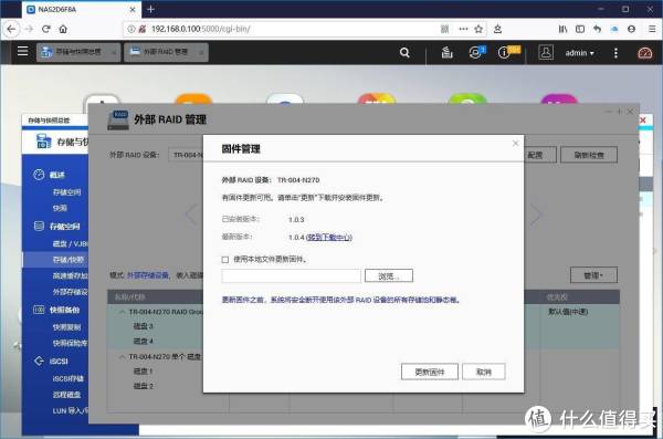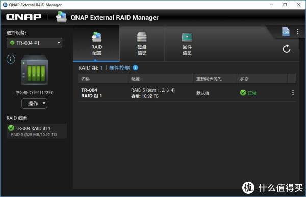 原汁原味的搭配下,威联通QTS管理系统能够准确识别TR-004的信息,并进行精确的状态查询。当然固件也可以直接在QTS中操作升级。