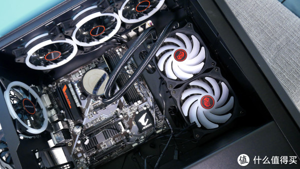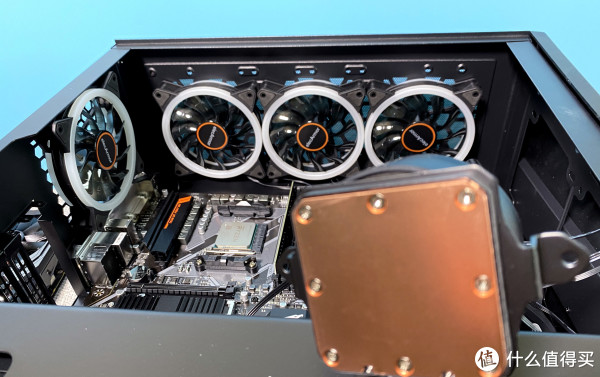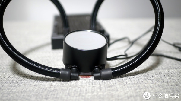 ▼水冷侧面是塑料材质,表面有细腻的磨砂处理,顶部有一个镜面的LED灯
