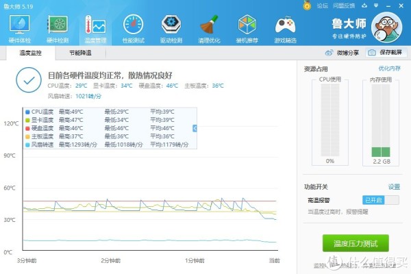 ▼进行了1局LOL游戏后(4K分辨率,所有视频设置最高)CPU温度最高为49℃,平均温度为39℃,控制的不错,风扇转速一直维持在1000转/分钟。