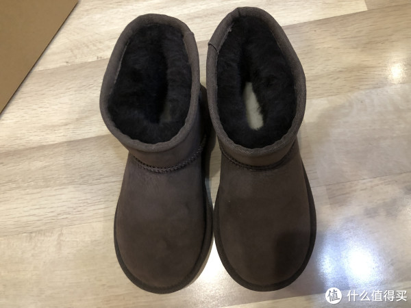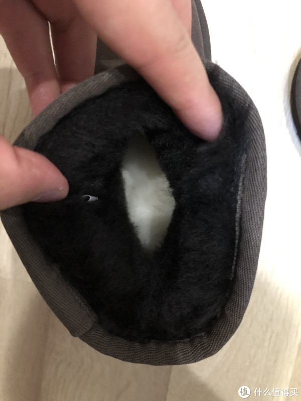 绒毛从鞋帮上部一直覆盖到鞋内,与灰色款不同,这款咖啡色雪地靴的帮内绒毛是分色的,鞋帮的绒毛是黑色,鞋底的绒毛是白色的,可谓黑白分明