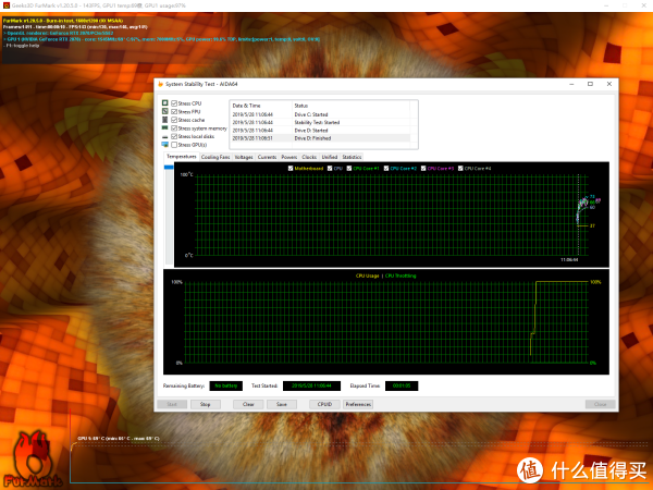 开启整体功耗检测的同时再打开用来检测显卡温度满载负荷 FURMARK(我们俗称的甜甜圈)来看下这时候整套主机的功耗值达到多大。