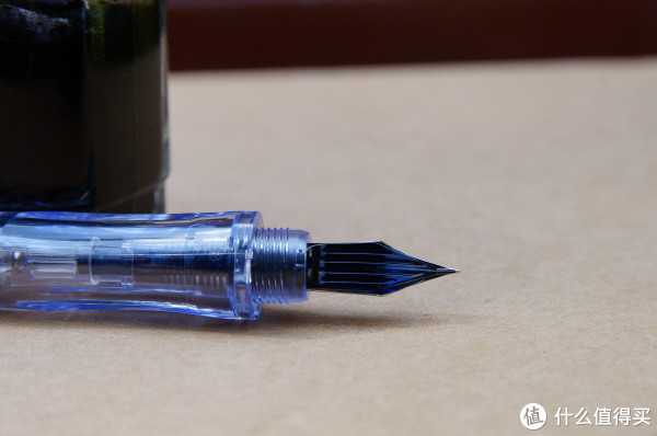 笔尖的设计类似百乐笑脸,不过图案比较规矩没有像笑脸一样做的比较卡通。笔尖 上可以看到百乐的英文LOGO以及比较的粗细规格。合盖方式采用了比较少见的旋钮式,由于比较太靠近旋钮位置,旋钮位置很快就会充满墨水,美观度有所影响。