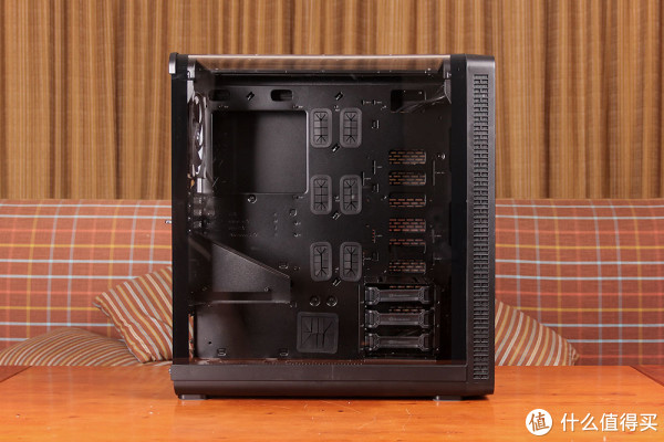 由于机箱采用非常规的侧透模式,顶部无法安装冷排及风扇,实际被安排在了正面,对应的机箱右侧板则采用开孔的设计,用于排风。