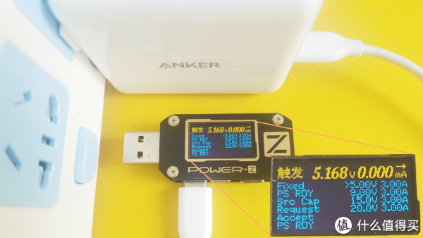 首先使用Power-Z 测试仪的档位诱骗功能,来测试ANKER 60W PD双口充电器的PD档位,测试中用于连接的数据线来自于Anker PD快充套装中的USB-C to USB-C。