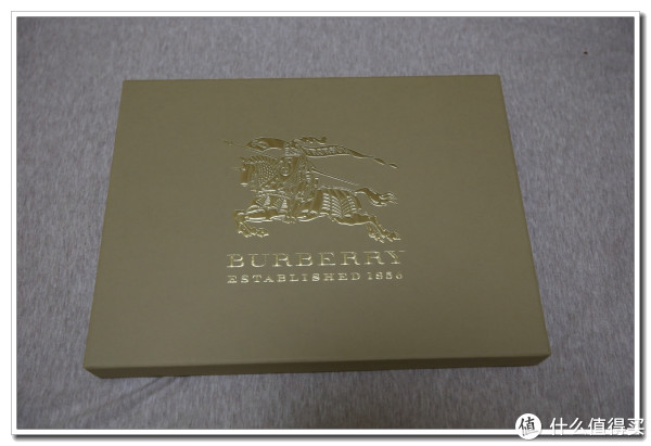 朴实无华的卡其色盒子,从外观就能看出是装的围巾,正面巨大的骑士logo,下方BURBERRY Established,盒子的表面不是光滑的,而是有一定的摩擦质感,和burberry别的单品的盒子质感基本一致。