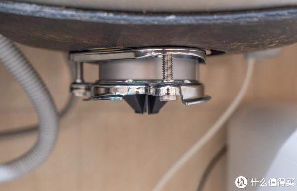 接着再把垃圾处理器挂到落水口组件上,向逆时方向拧,拧不动之后再用内六角扳手辅助锁紧,然后把溢水口、出水口、入水口的管子都接好。安装完成的垃圾处理器可能是悬空的,如果担心时间久了会让水槽变形,可以自己找点东西垫到处理器下面,注意不要用刚性材料垫,以免机器运行时有共振。