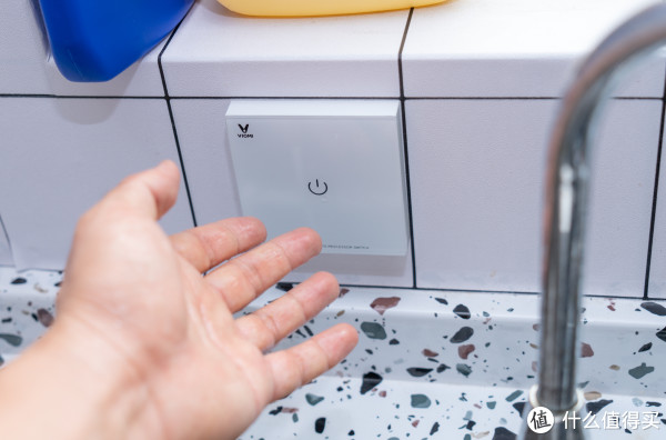无线遥控开关背面使用的是3M胶,可以粘在洗菜盆旁边,这样伸手就能够到,湿手也可以操作开关,而且开关本身也有一定的防水性能,加之采用的是3V供电,安全性方面不需要担心。