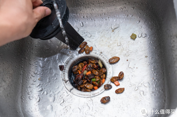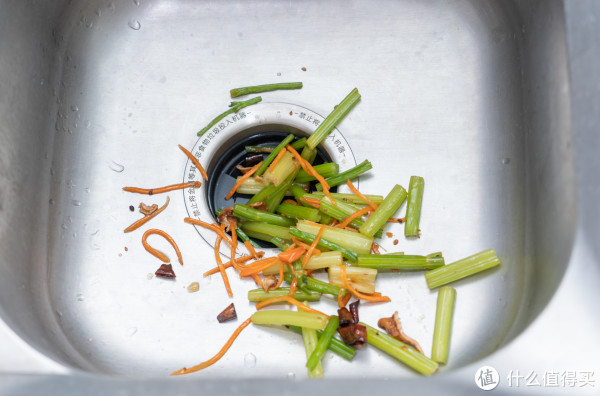 接着我们来测试一下机器处理厨余垃圾的效果,在使用垃圾处理器时需要先打开水龙头再启动机器。等机器完全启动起来,再开始投放垃圾。普通家庭的厨余垃圾大都是青菜类的混合垃圾,处理这些垃圾很轻松,机器的噪音没有明显变大,一会就把青菜都处理完了。处理完垃圾之后大家最好先让机器运行一会再停机,这样可以把研磨室内的垃圾全都排出去。