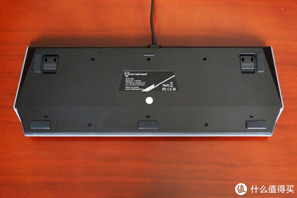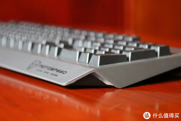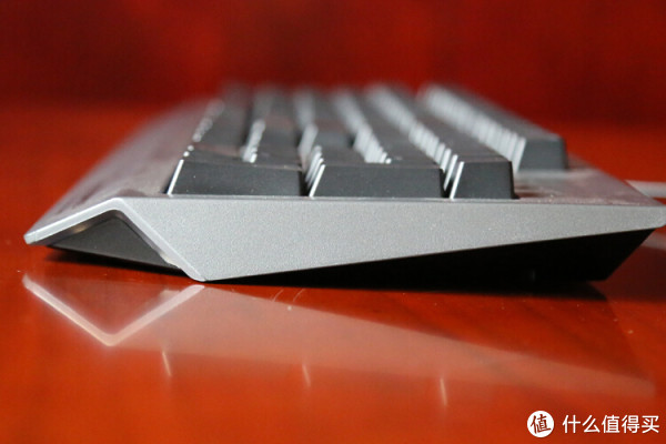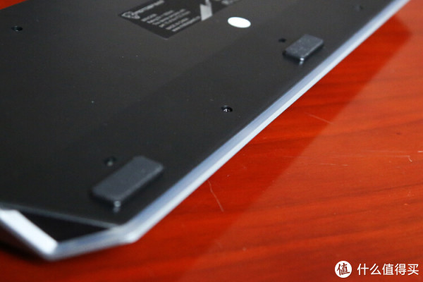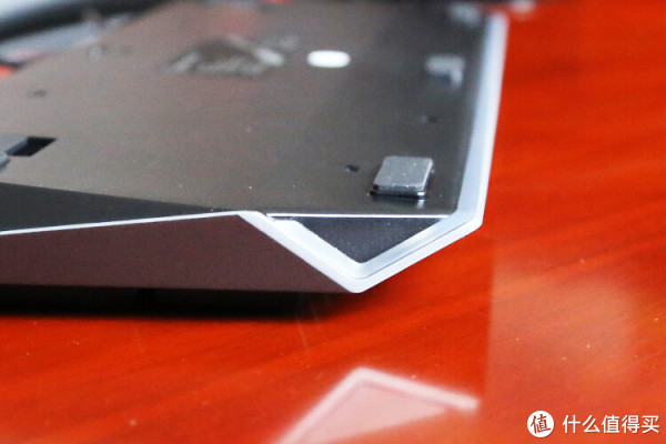 在键盘背部的边缘处,有向内凹陷倾斜的设计,从侧面看上去形成了一个梯形,也大大加强了整体的视觉效果。下方有三个防滑垫和一圈白色的灯带。