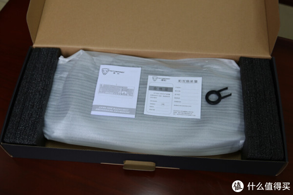 打开包装键盘被软泡沫袋包裹,两端有泡沫固定,防护效果较好,除了说明书还配备了拔键器。说明书主要对产品的参数、特色,以及背光灯效、底部氛围灯灯效、多媒体组合键介绍等等。