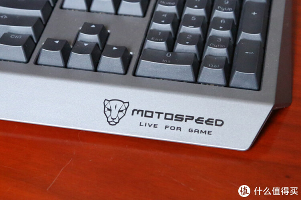 键盘下方突出的部分设计了一定坡度的装饰性掌托,最右侧印着摩豹的Logo及标语。