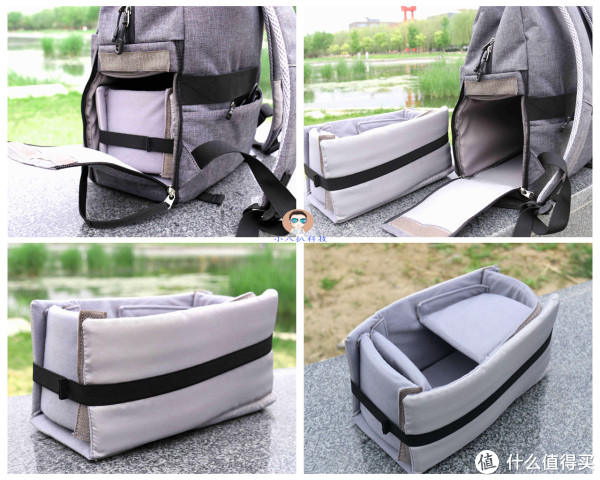 侧边的这个相机收纳层,拉开侧边的拉链,可以去除内胆,这个内胆是可拆卸的,如果不装相机的话,是可以拆开,增加更多的收纳空间。内胆是加厚的内壁,有很好的防撞、防压效果。灵活的抽拉,可以很方便的收取相机。