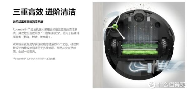 iRobot Roomba i7+ 采用了s进阶版三重高效清洁系统,双效组合胶刷协同工作,一根胶刷负责剥离污垢,另一根则反方向转动以扫入污垢,同时还能有效避免头发、线缆等物件的拆绕。