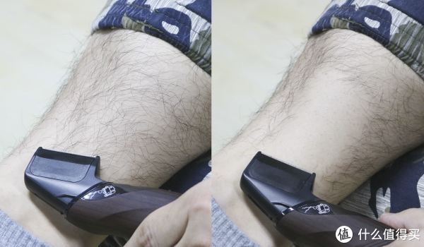 为了更好地展示剃毛效果,我们找了腿毛比较浓密的同事来进行测试,因为腿毛的修剪一般都需要完全剃干净,所以我们并没有选择定长配件,而是只使用了皮肤保护配件,在剃毛的过程中并不会有剃毛器拉扯毛发的感觉,反而觉得很顺畅,有点像小时候剃头发的感觉,基本上只需要反复来回两次次就能将腿毛完全剔除干净了,而且对于皮肤也完全没有伤害,绝对是安全剃毛的选择。