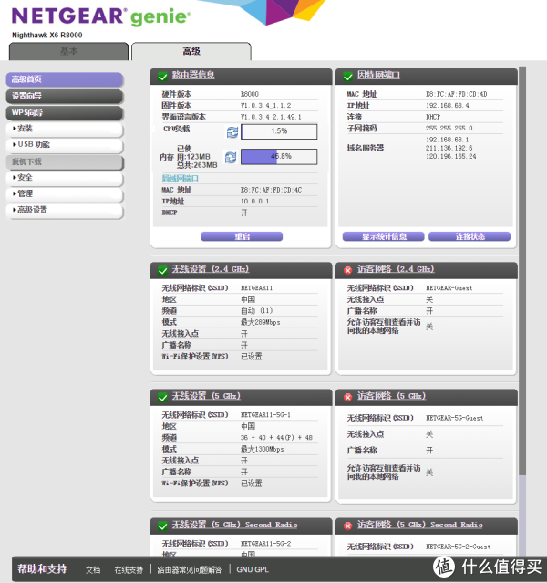 左边菜单部分有设置指引,如果对路由器比较熟悉的,可以自己手动设置,在安装部分进行设置,对于WIFI,R8000提供了2个5G的频段,1个是36到48频段,一个是149到161频段,可以分开设置,也可以选择设置为1个SSID,系统会根据负载情况自动分配频段,十分的智能与强大。