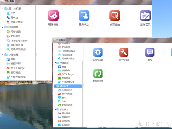 控制面板包含“用户与权限”“网络服务”“存储管理”“通用设置”“系统状态”,这个就相当于windows的控制面板功能,系统所有的关于整机的设置都在这边进行。各个硬件功能的查看和监控;回复出厂设置,软关机和重启功能也在这里。