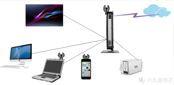 铁威马F2-220通过有线以千兆连接到 网件DR4300千兆路由器上面,外网是12M移动光宽带(下月升级到20M,采用PPPOE拨号,无固定IP,拨号获得的是移动大内网的IP,非合法internet地址),家庭笔记本,pad,移动设备通过2.4G/5G连接到DR4300路由器,智能电视通过有线和2.4G连接到RD4300路由器。
