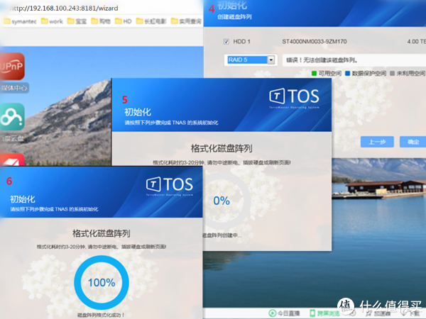 命名设备名字,这边一般直接默认就可以了,选择时区到beijin。输入管理员密码和密保邮箱,点击发送验证码后,这一步你可以等待接收验证码填入或者是直接点击下面的跳过即可,接着下一步。根据自己安装硬盘的具体情况选择对应匹配的RAID阵列级别或者是非阵列类别(具体的阵列知识可以参考帮助文档或者是咨询度娘),接着是格式化磁盘或者是磁盘阵列。时间长短具体看硬盘容量和阵列级别而定。格式化完毕后会自动刷新页面跳转到TOS登录界面,输入默认的admin用户和设定的密码后登陆,进入TNAS系统。到这里为止你的NAS才算是刚刚开始,你的多媒体中心才正式有了八字的一撇。
