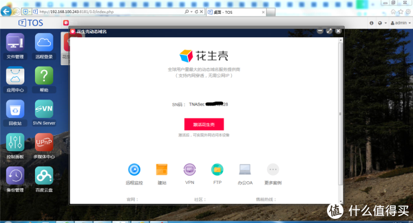 铁威马F2-220 NAS集成花生壳内网穿透免费版,无需复杂的路由器设置,对外网地址没有任何要求,只需要简单的激活花生壳内网穿透版就可以了使用了,非常的方便和简单,一步一步的傻瓜设置就可以了。直接点击激活申请到的地址就可以跳转访问了。这里需要注意一点就是在激活花生壳内网穿透版本的时候,访问得到的域名和TNAS IP形成解析关系需要3-5分钟。一开始立即点击是无法访问的,等待映射关系被网络设备学习后才能访问,这个对有点网络知识的人是不难理解的。在公司测试了固定IP和家里的动态非internet合法地址都可以正常访问,功能强大的不要不要的,相信有这个需求的人和企业可以购买相应的流量服务,免费状态下一个月1G的流量基本上就是测试使用而已。
