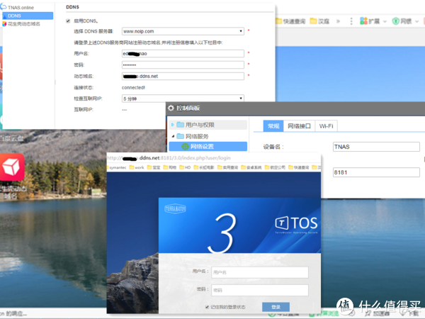 在相应的域名提供商web页面注册号账号和域名后直接填写到这里,点击保存会有connected的连接状态,如果是密码错误或者是其他填写错误,服务会自动关闭。这里需要注意一下几点:1.路由器上面要开端口映射把TNAS端口映射到外网,默认是8181端口,如果路由器支持DMZ的话,直接把TNAS放到DMZ区就可以了。2.要有合法的internet地址(不是能上网就有这个合法地址的,很多ISP运营商会保留合法的internet地址作为他用而在机房开辟一个大的局域网,赋予用户运营商局域网内地址,相当于用户在二级路由器下,我家里就是这种情况,出现这种情况是能联通但是无法回访,你可以打电话要求ISP给你合法的internet地址)。通过公司固定IP地址测试正常。通过家里的网络测试无法访问。假期结束后,一定要找ISP理论理论。