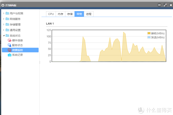 小文件(总量大概是5G,单个文件最大是50M的安装软件,一般都是小的2-5M的mp3文件)从PC上传到TNAS的均速保持在60MB/S左右,但是峰值较高,从TNAS下载到本地PC的速度基本保持在60MB/S左右。