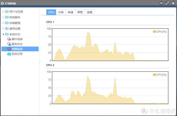 在同时从PC上传文件到TNAS和从TNAS下载数据到PC上面的测试如上第一个图,单纯的上传或者是单纯的下载对对带宽的利用率要高很多。硬件资源监控方面,在内存方面基本是保持25%的利用率,对于2G内存的F2-220已经相当够用了,所以暂时没有必要增加内存。但是CPU开销显得有些大。希望后续改进机型可以提高CPU的效率。