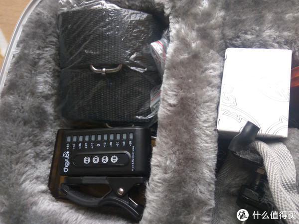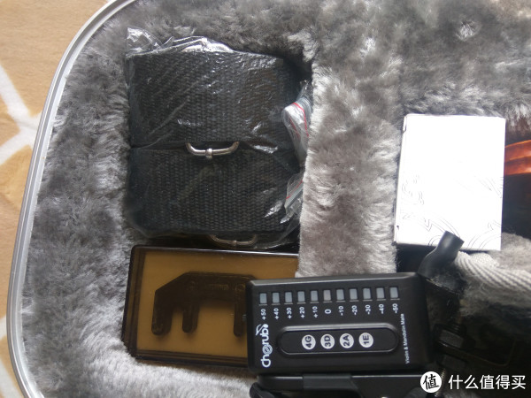 小槽里放着肩带,调音器和静音器