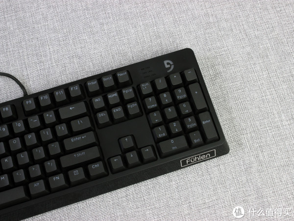 为了给LOGO留下足够多的位置,指示灯则移到了左侧,竖直排列在一起。但如果倾角过大的话,指示灯会不太明显,甚至最下面的指示灯会被“Num LK”按键挡住。