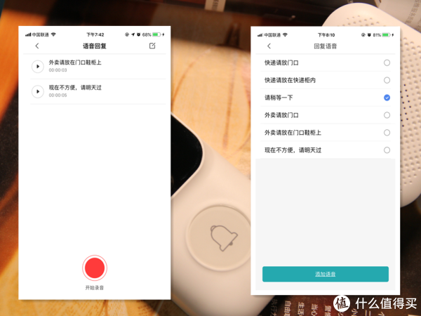 如果访客为快递小哥且不方便让对方入室可发送语音告知快递放门口即可,如果快递丢失又可调取门铃侦测记录的视频来取证,相当于有监控摄像头的功能。客户端内置常用的几句对话,支持自定义语音。