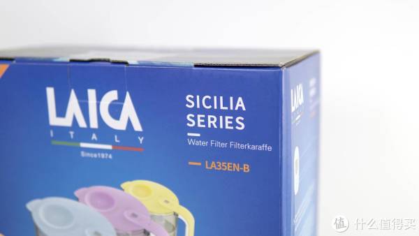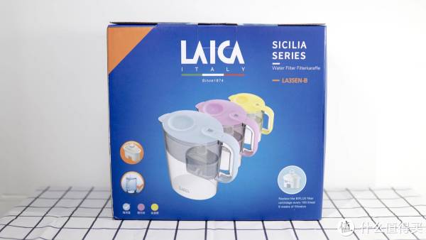 莱卡西西里净水壶整体包装以深蓝色为主,右上角的“SICILIA SERIES”表明此款莱卡净水壶为的西西里系列,下文就以莱卡西西里净水壶来称呼,而正面三款配色的莱卡西西里净水壶正是此次推出的,包括“海洋蓝”,“樱花粉”,“金盏橙”三个颜色,不过这个“金盏橙”个人觉得就是黄色