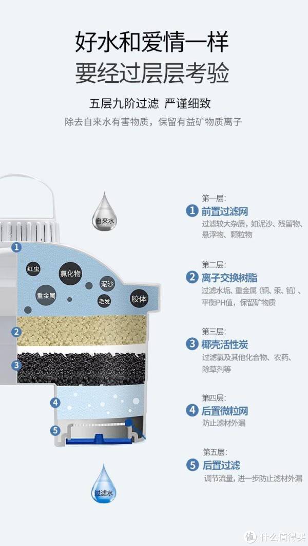 还是那个熟悉的味道,双导流设计,五重九阶过滤,除去水中余氯、重金属、泥沙等有害物质,保留钙、镁、锌等微量元素,包括前置过滤网、椰壳活性炭、离子交换树脂、后置微粒网、后置过滤